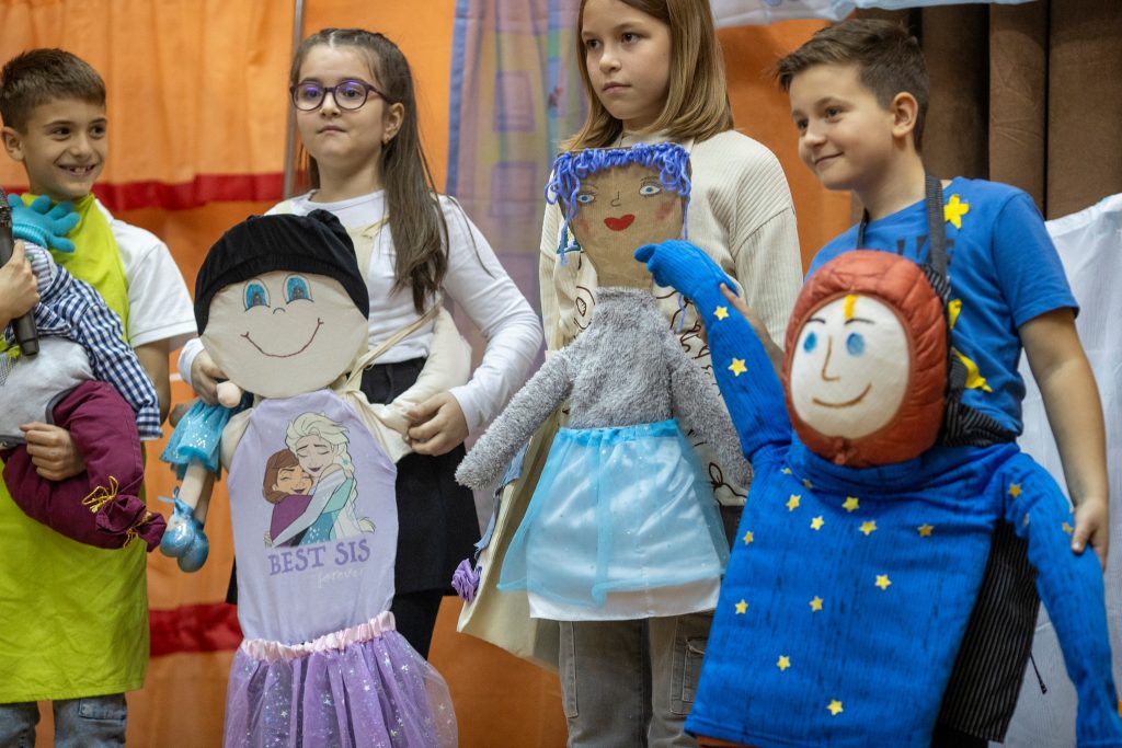 Copiii au prezentat, pe scenă cele cinci piese de teatru ale căror personaje au fost reprezentate de păpușile marionete confecționate din resturi de materiale textile.